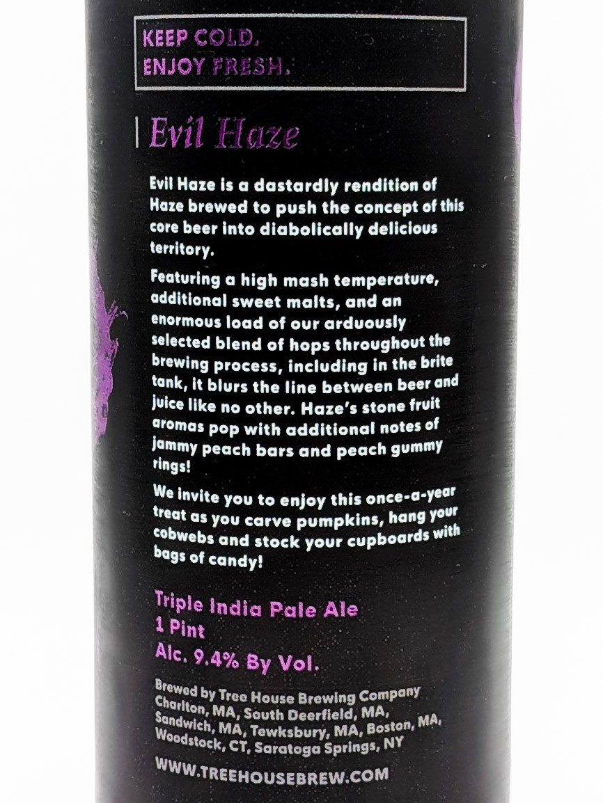 Vedy hazy and very murky with minimal head retention, smells of white grape juice, passion fruit, and plum. The taste is rich and intense with flavors of white and red grapes, passion fruit, peach, plum, guava, and nectarine on a silky smooth, pillowy soft, and extra thick full body. The finish is long and moderately bitter, featuring notes of apricot, overripe banana, dried papaya, floral hops, yuzu, and a tiny hint of pine. Overall, this is overwhelmingly luscious; a singular experience. Comparable to any other beer in the Evil series, this one being a bit more stone fruit focused.