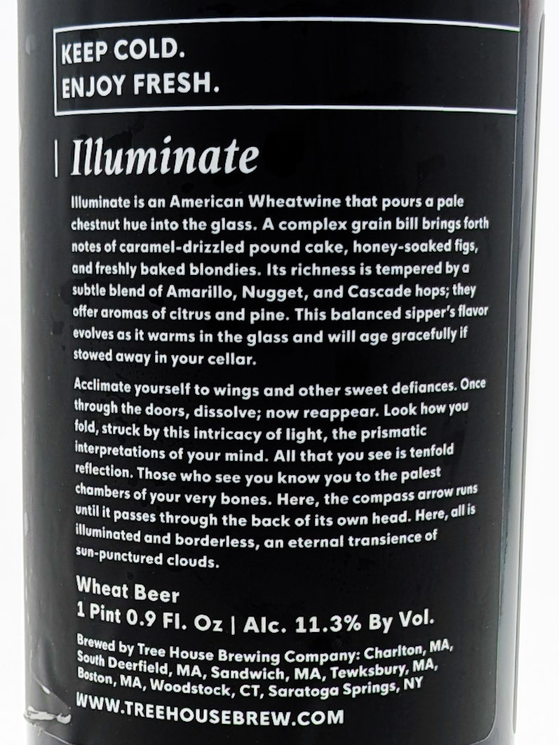 Clear with virtually no head retention, smells of honeyed oats, strawberry creme, and alcohol. The taste is dense and bready with flavors of wheat crackers and toasted bread, but also with fruity undertones of apple, fig, and dates on a slick full body. The finish is long and moderately bitter, featuring notes of apricot, raisin, brandy, grapefruit peel, pine, and herbal hops with a touch of warmth in the throat. Overall, this is surprisingly layered, one of the more complex beers I’ve had the pleasure to sample. I’ve had a couple barrel-aged wheat wines in the past, but this one is not aged, and is far more interesting to sip on. Quite illuminating!